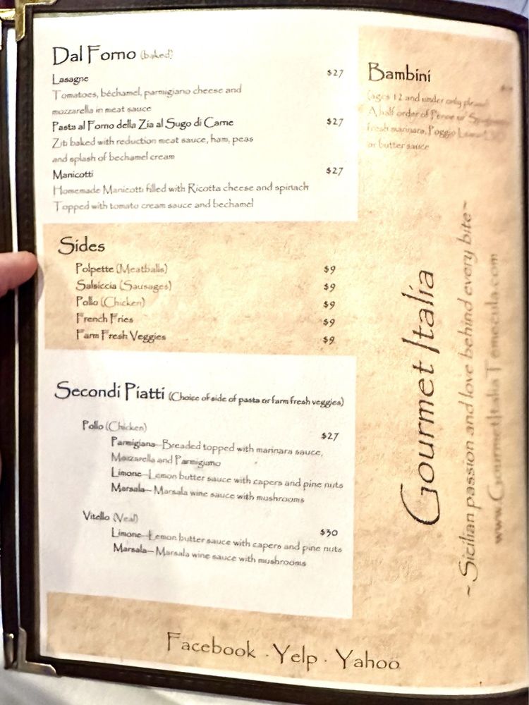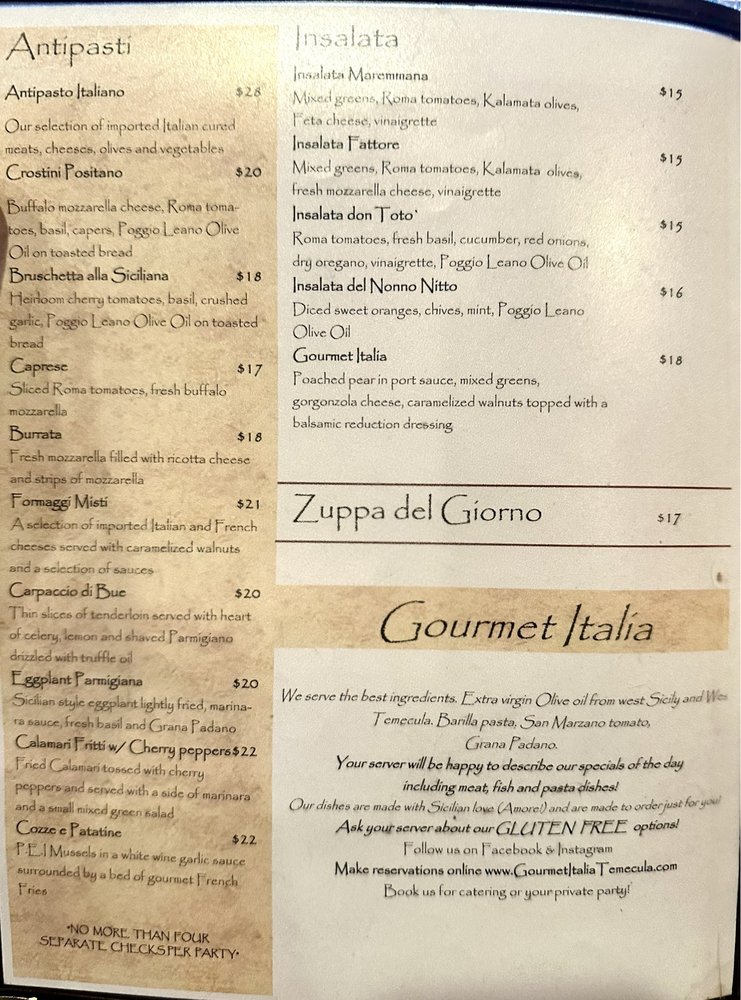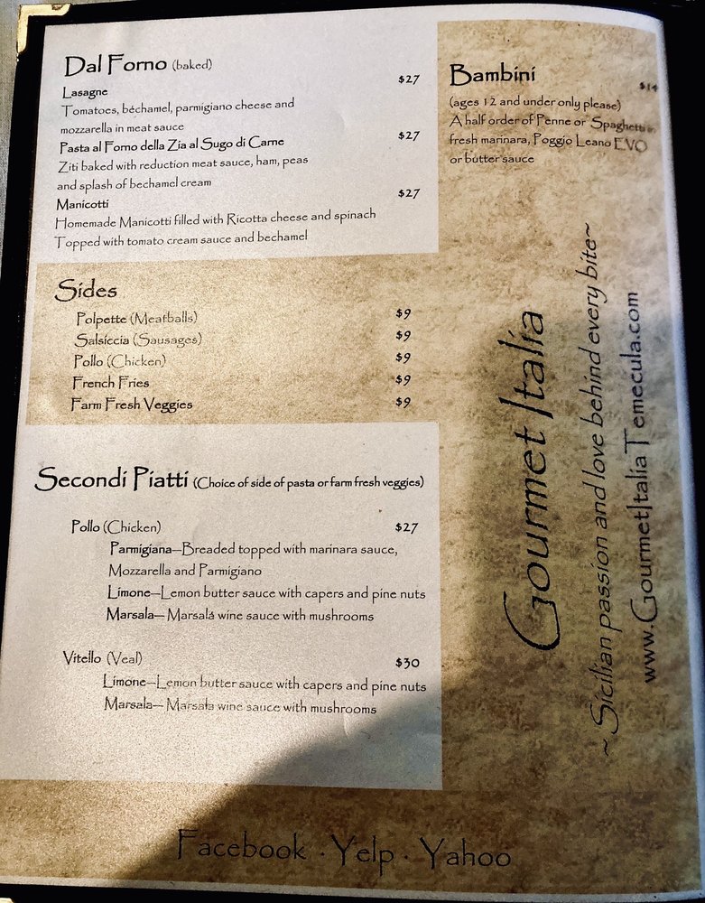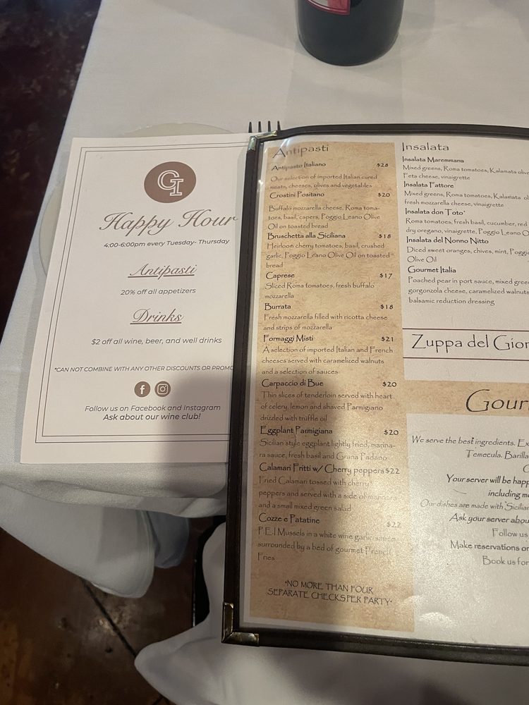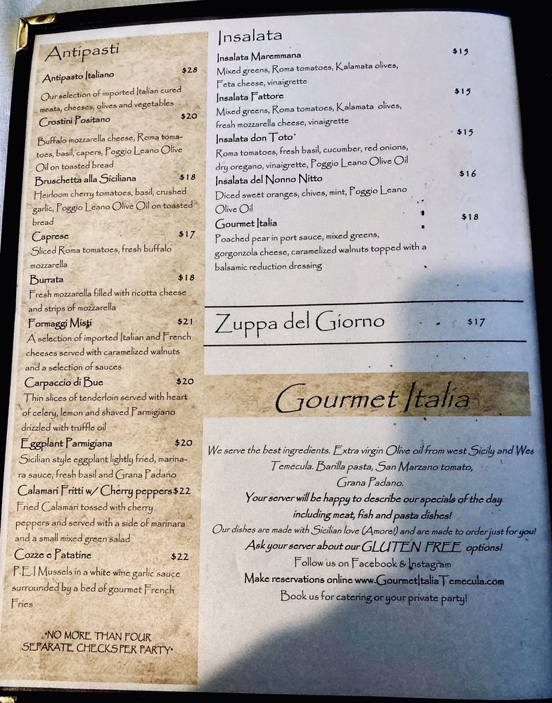 Introducing Gourmet Italia, a high-end Italian restaurant located in Temecula, CA. This upscale establishment offers a variety of amenities such as reservations, takeout, delivery, vegan options, and wheelchair accessibility. The menu boasts traditional Italian dishes like lasagna, chicken fettuccine, ravioli, and seafood pasta. The ambiance is intimate and romantic, making it perfect for special occasions. Customers rave about the impeccable service and delicious food, praising the authenticity of the cuisine. With a full bar, happy hour specials, and outdoor seating, Gourmet Italia provides a unique dining experience that is both elegant and inviting. If you're looking for an authentic Italian dining experience with top-notch service, Gourmet Italia is the place to be.